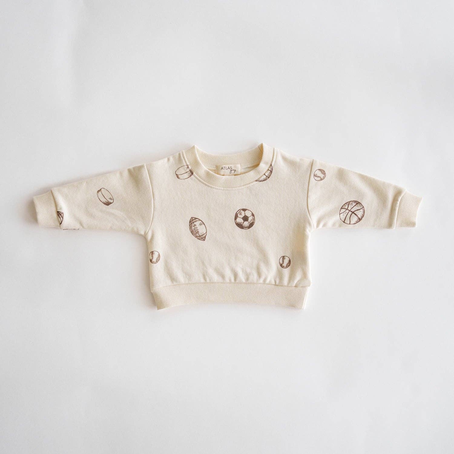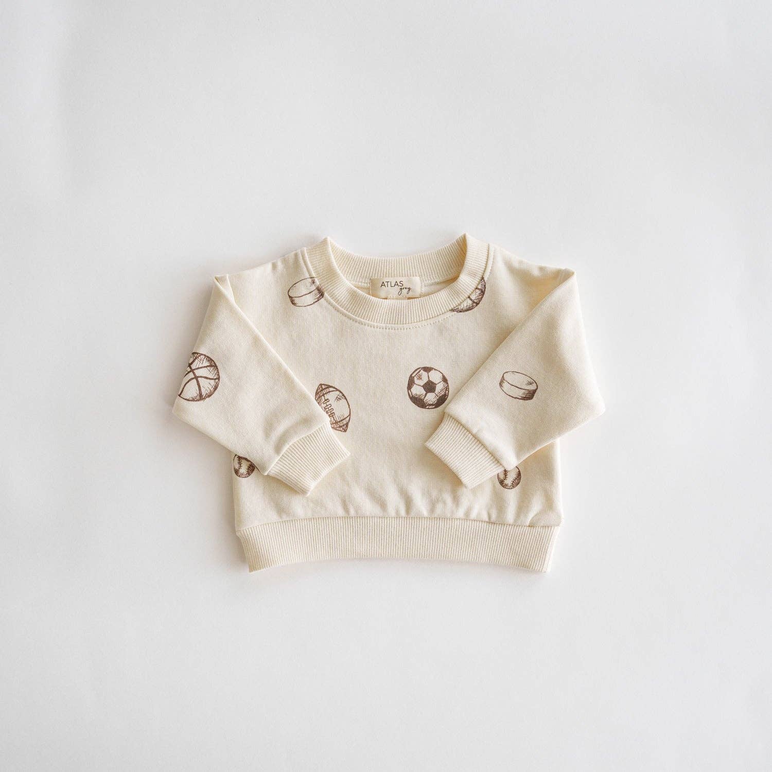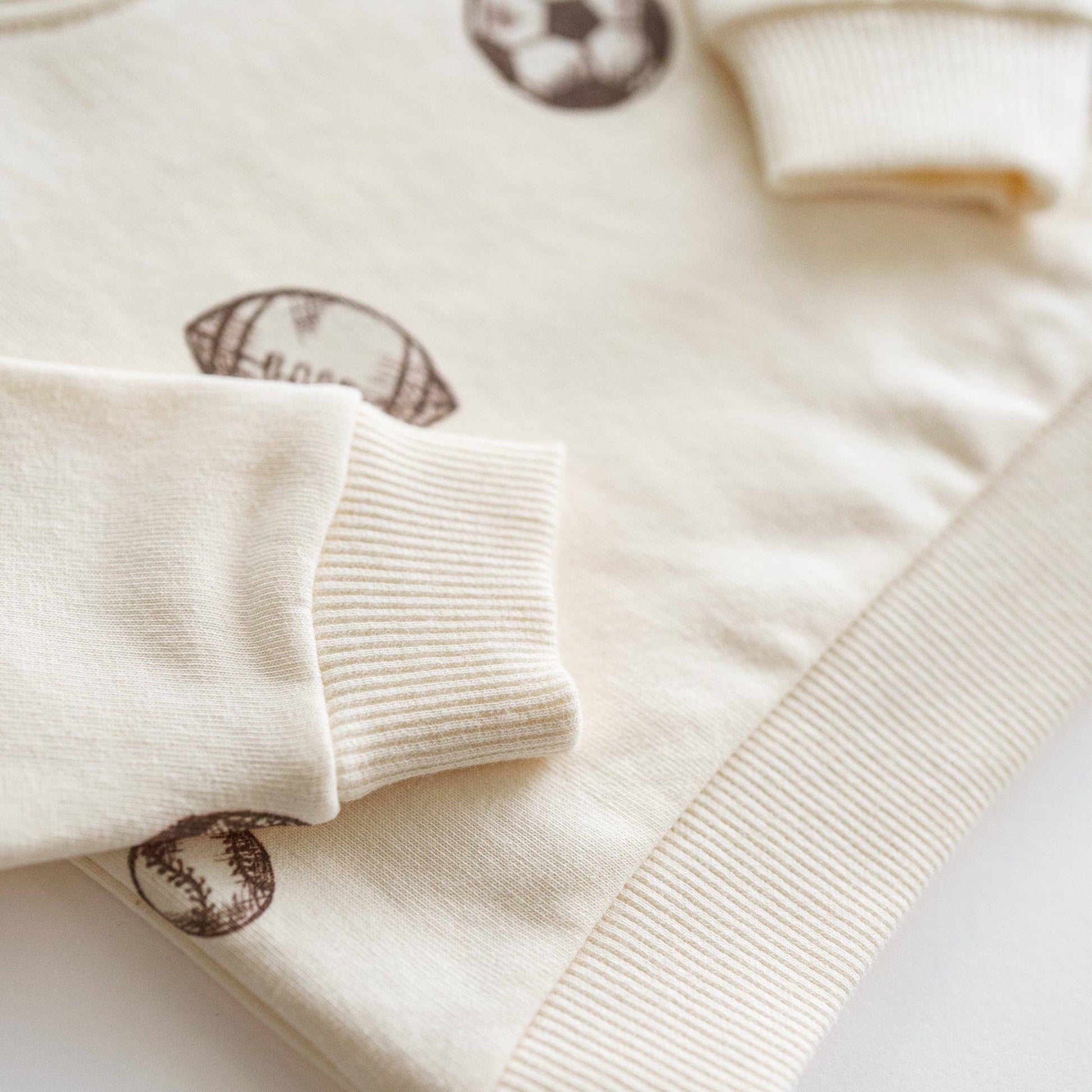 This crewneck comes to life with a hand-drawn sports design. It's not just a garment; it's a canvas that reflects the playful spirit of those budding athletes. Whether it's for crawling around the house or playing ball on the grass, this top is designed for comfort and movement.