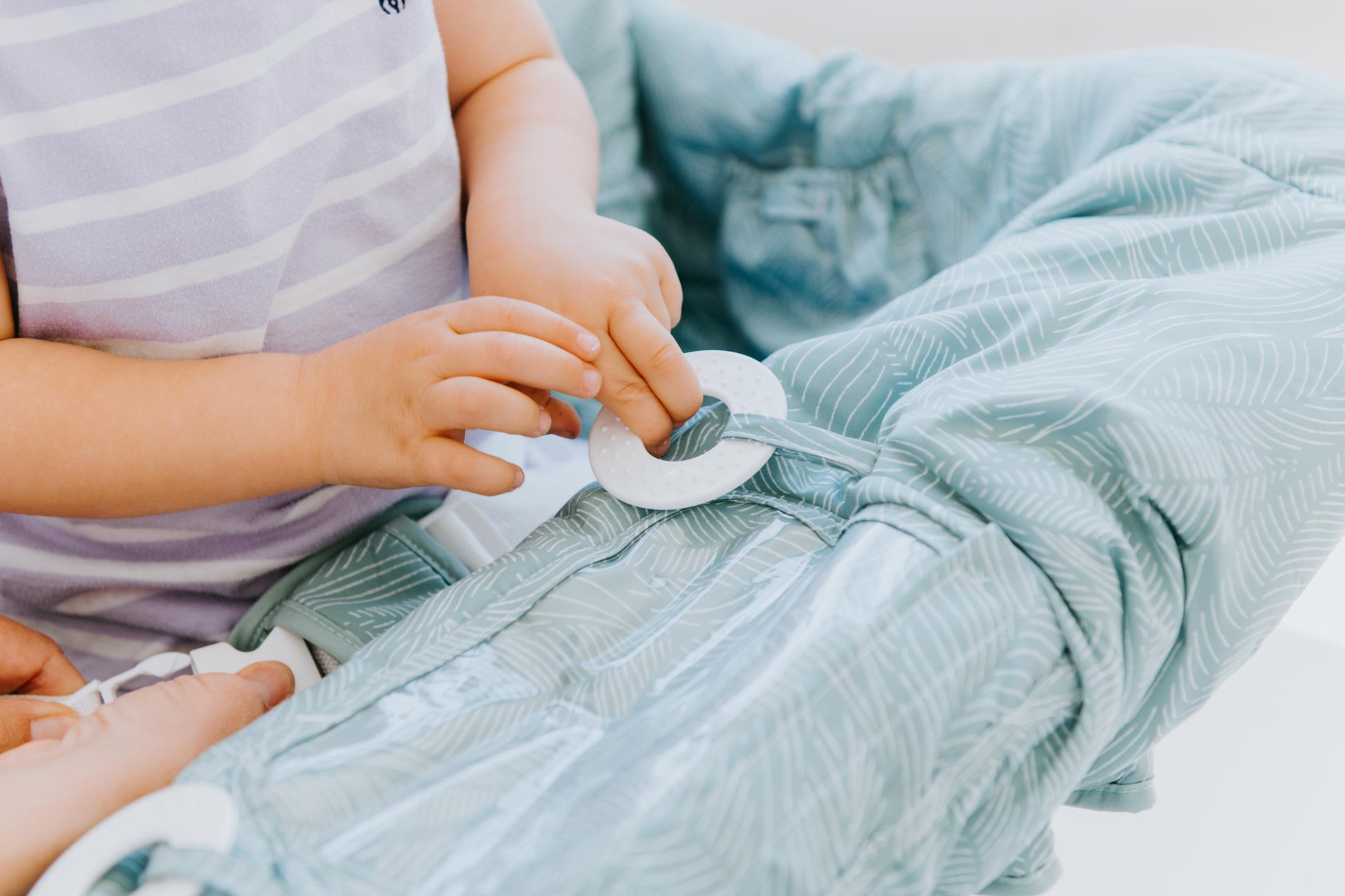 Our Binxy Baby Shopping Cart Cover in velvety soft (and washable) fabric provides just the right amount of cushion and protection for your child. It quickly and easily slips onto most carts, provides a 360 degree germ barrier utilizing our proprietary attachment clips, then simply folds up within itself for easy transportation and storage. The see-through pocket keeps screens secured and clean, while the two attached toy rings provide entertainment for your child while you shop!