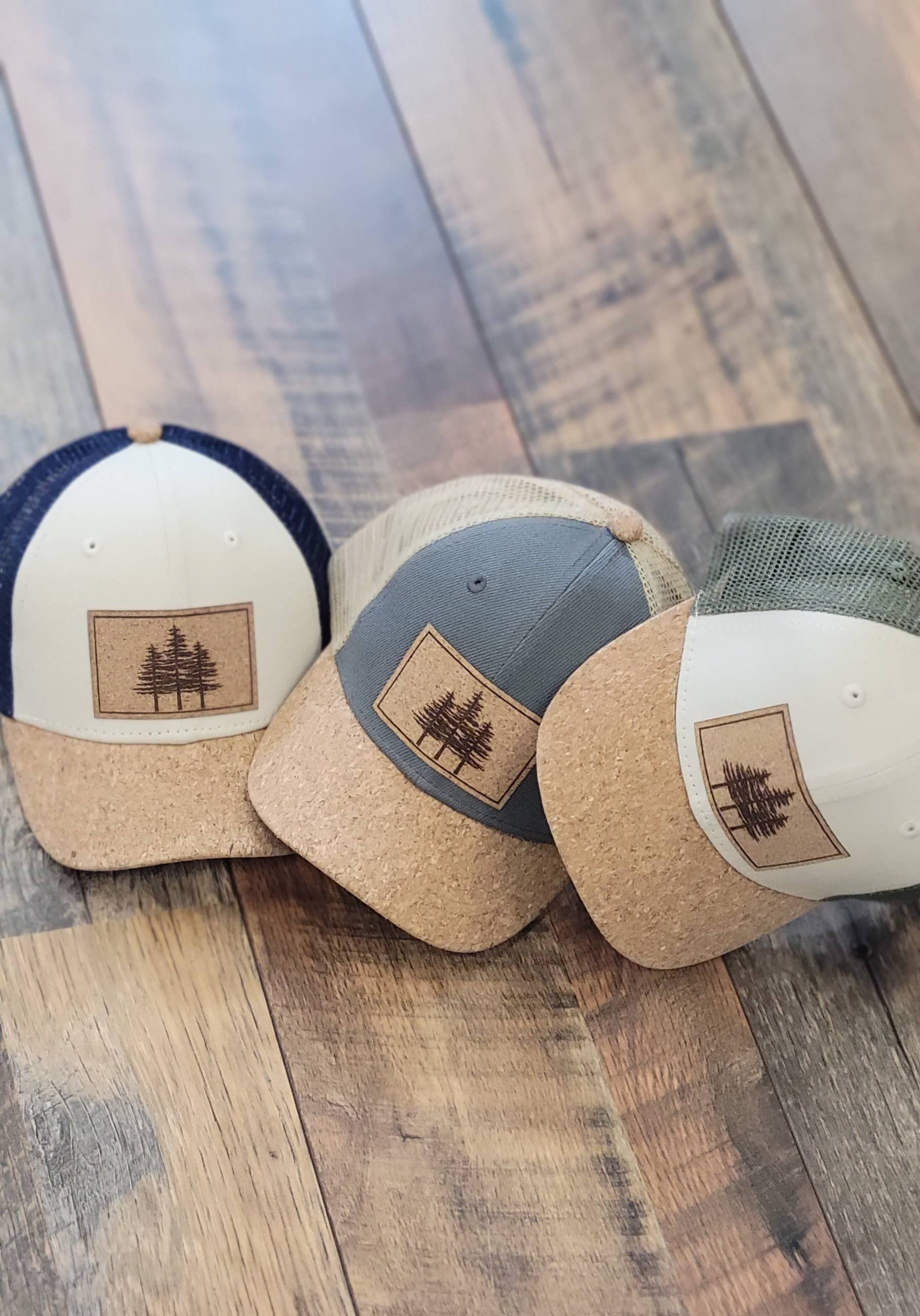 laser engraved cork patch, matching cork bill, mesh snapback adjustable closure.