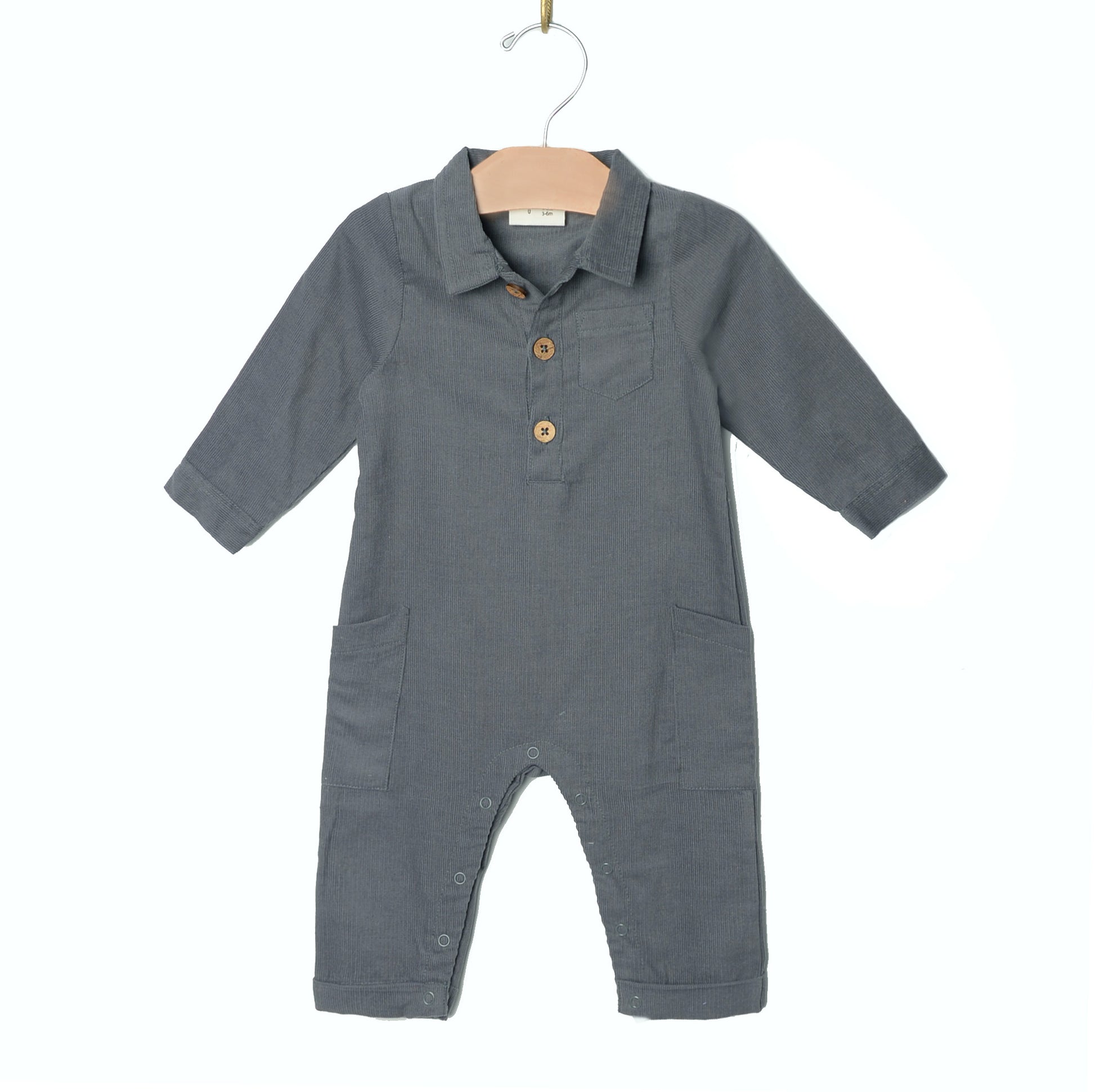 The collar long leg romper in 100% cotton baby cord features coconut buttons at the front and snaps along the legs for easy changes. Functional pockets for their treasures will be a favorite.