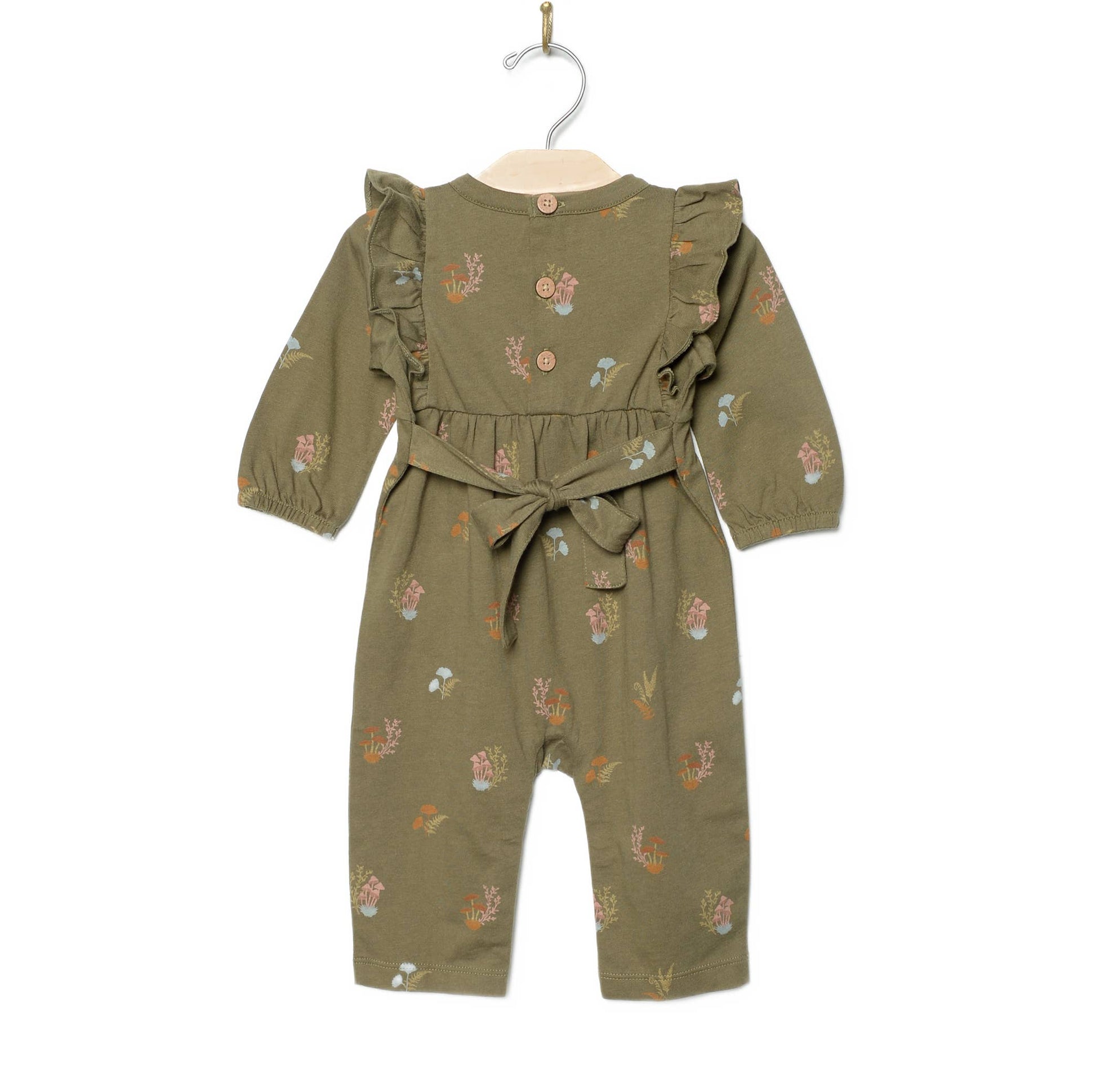 Our best selling long leg romper in 100% combed cotton jersey and our new lichen color of the popular mushrooms print! Featuring flutter shoulders and long sleeves, a tie-bow back, and snaps along the legs for easy changing.