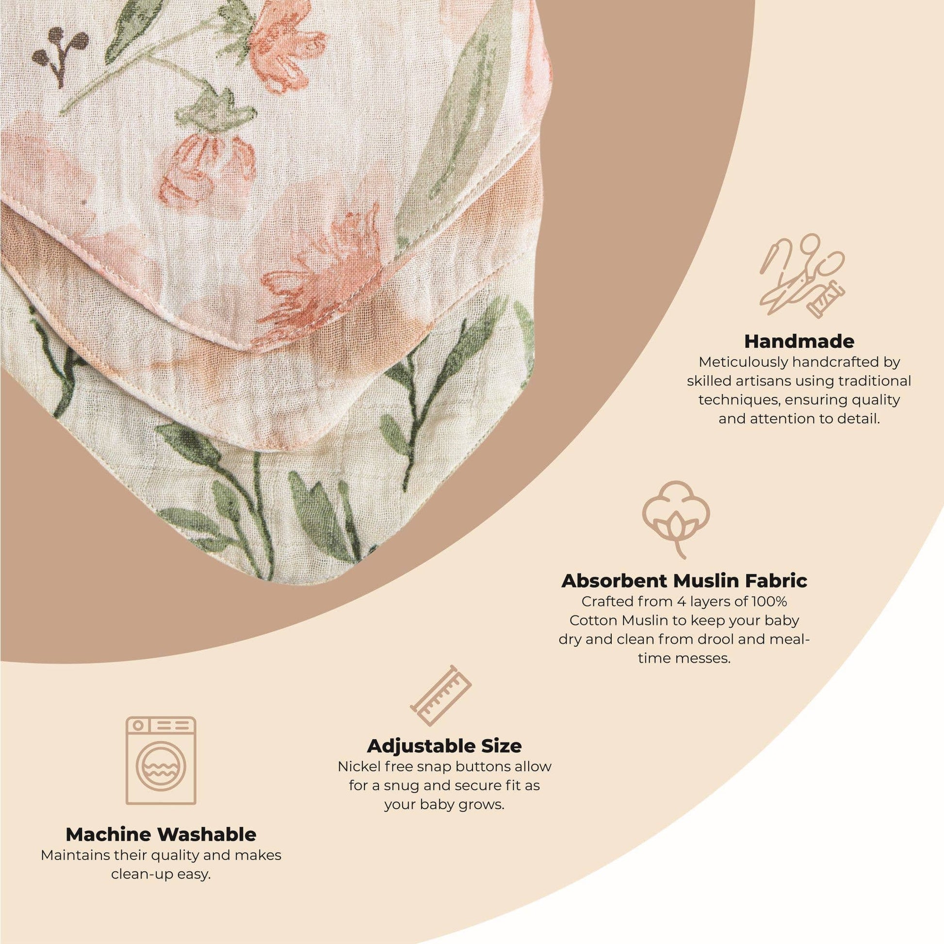 Lightweight and absorbent, our 100% cotton 4 layer muslin bibs are the perfect layering piece to accent baby's "outfit of the day." Featuring adjustable snaps to grow with baby, the set includes 3 unique bib designs. Bibs are an essential to keep baby clean and dry. The perfect gift idea to bundle with our swaddle wraps and burp cloths available in the same print designs.