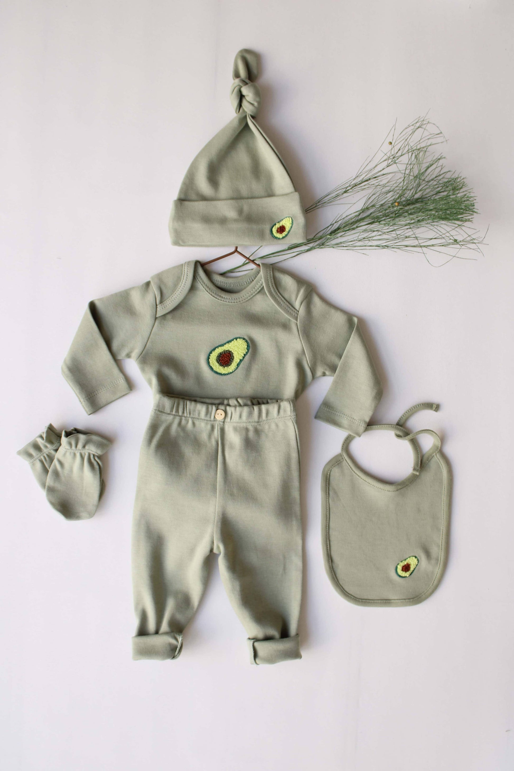 Introduce your little one to the world of adorable style with our charming 5-piece Avocado Patterned Newborn Set! Featuring a delightful avocado design, this playful collection adds a fun touch to your baby’s wardrobe. Each piece is crafted from soft, breathable fabric, ensuring maximum comfort for your newborn’s delicate skin. The set includes all the essentials: a long sleeve bodysuit, matching pants, a beanie, mittens, and a bib. Perfect for everyday wear or special occasions, the cheerful avocado pattern brings a unique flair to any outfit. Whether you’re celebrating a new arrival or searching for the perfect gift, our Avocado Patterned Newborn Set is a must-have for every parent. Embrace the cuteness and comfort of this delightful ensemble! Details and Care * Made in Turkey * 100% Cotton * Machine wash cold, line dry