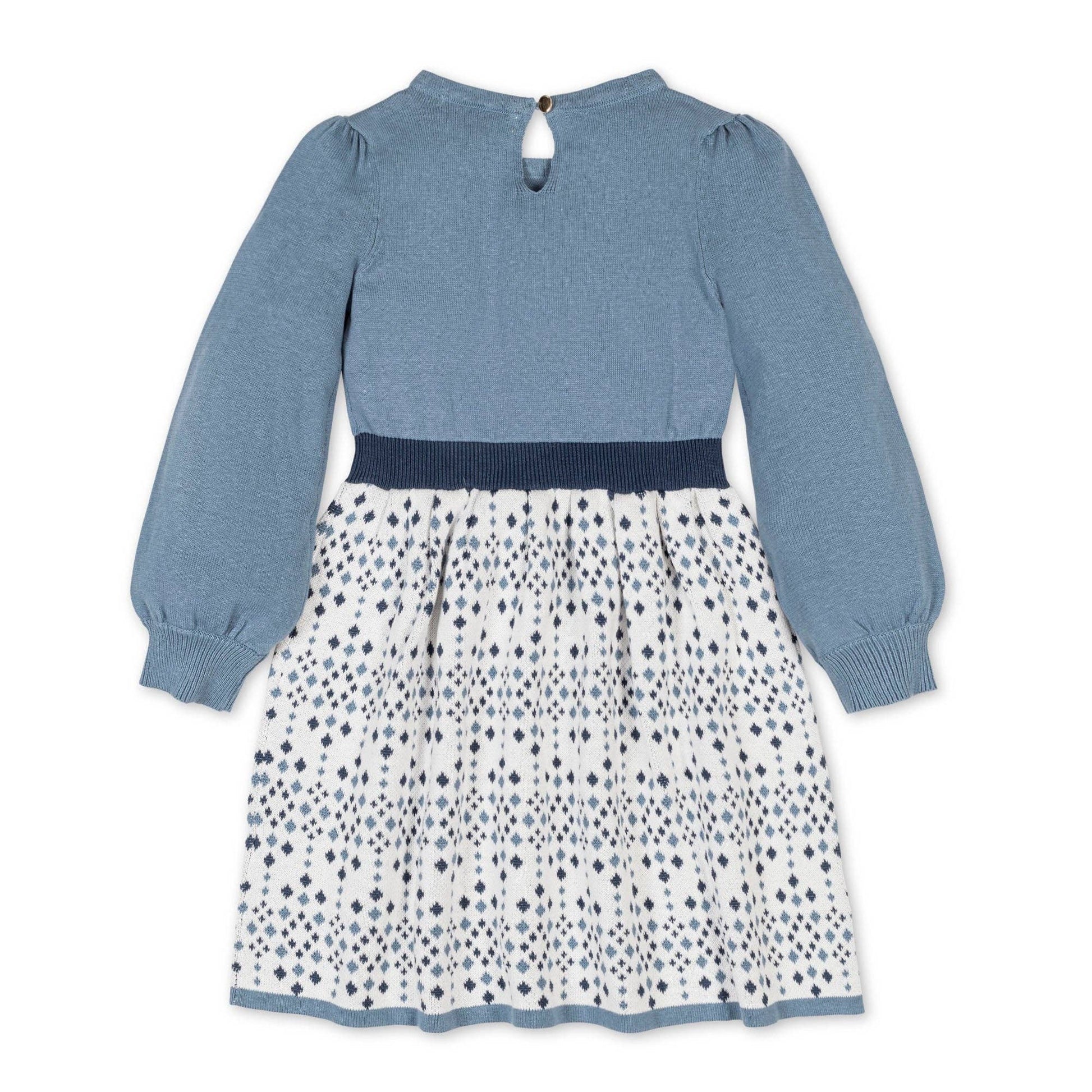 Our sophisticated long sleeve skater sweater dress in soft organic cotton exudes timeless charm for when temperatures start to drop. Features a solid bodice paired with a sweater intarsia skirt, decorative bow at the waist, and a back keyhole closure for easy dressing. Picture perfect and also so comfortable to wear.