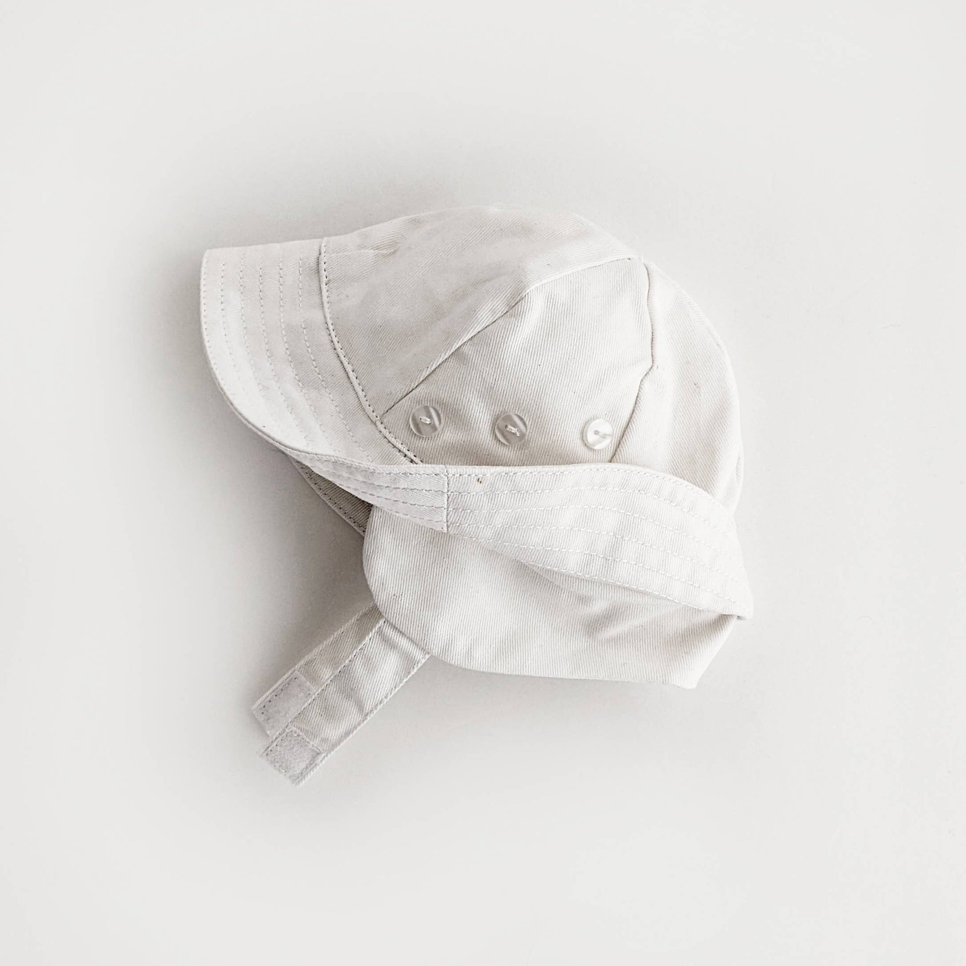 Perfect for year-round wear, this upf 50+ hat is functional and so handsome! Made in white cotton twill, it has a flap to cover the neck and ears to protect from the wind. Three little buttons accent the crown. Made in an easy-care cotton and fully lined for comfort. 100% cotton. Cold hand wash, lay flat to dry. Made in China.