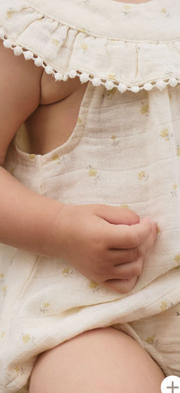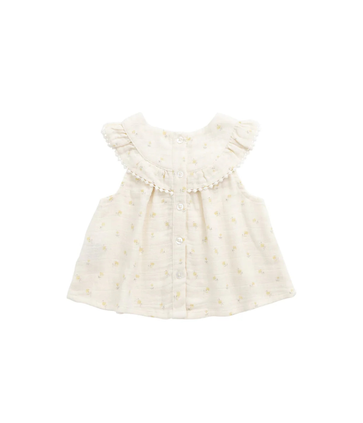 A sweet and timeless piece for your little one. The Annalise Top in Vintage Ditsy features a delicate floral print in soft, muted yellow tones, with a trimmed ruffled collar and buttons all the way down the back. Crafted from airy organic muslin, this sleeveless top is perfect for warm days or layering under cosy knits.