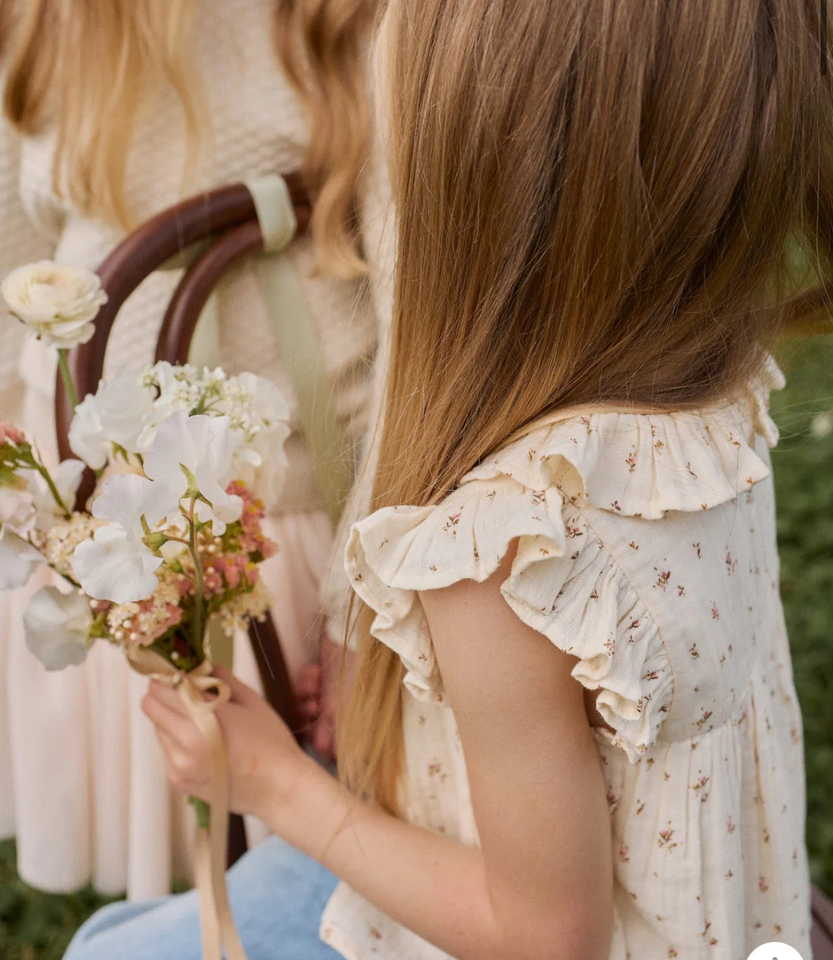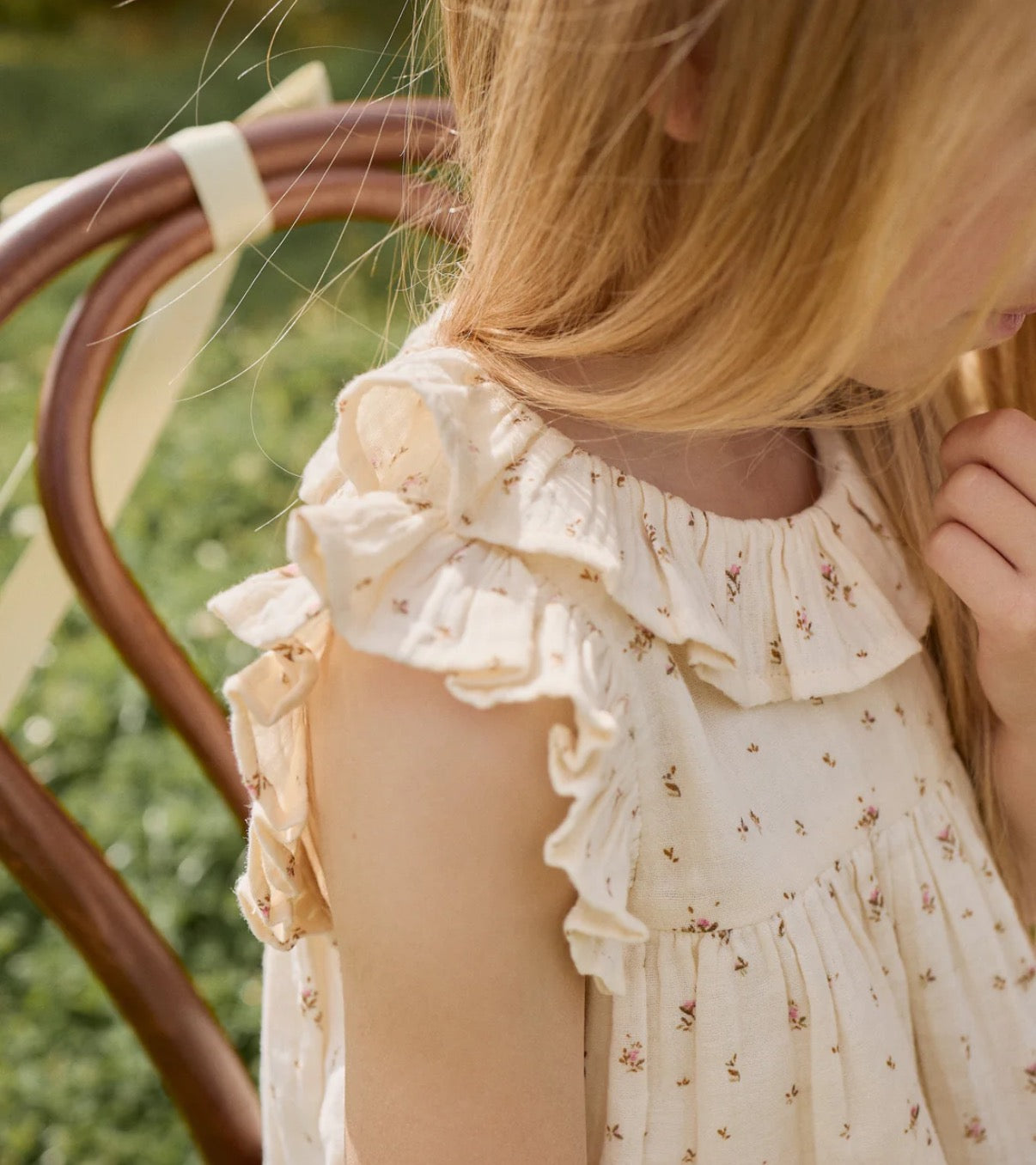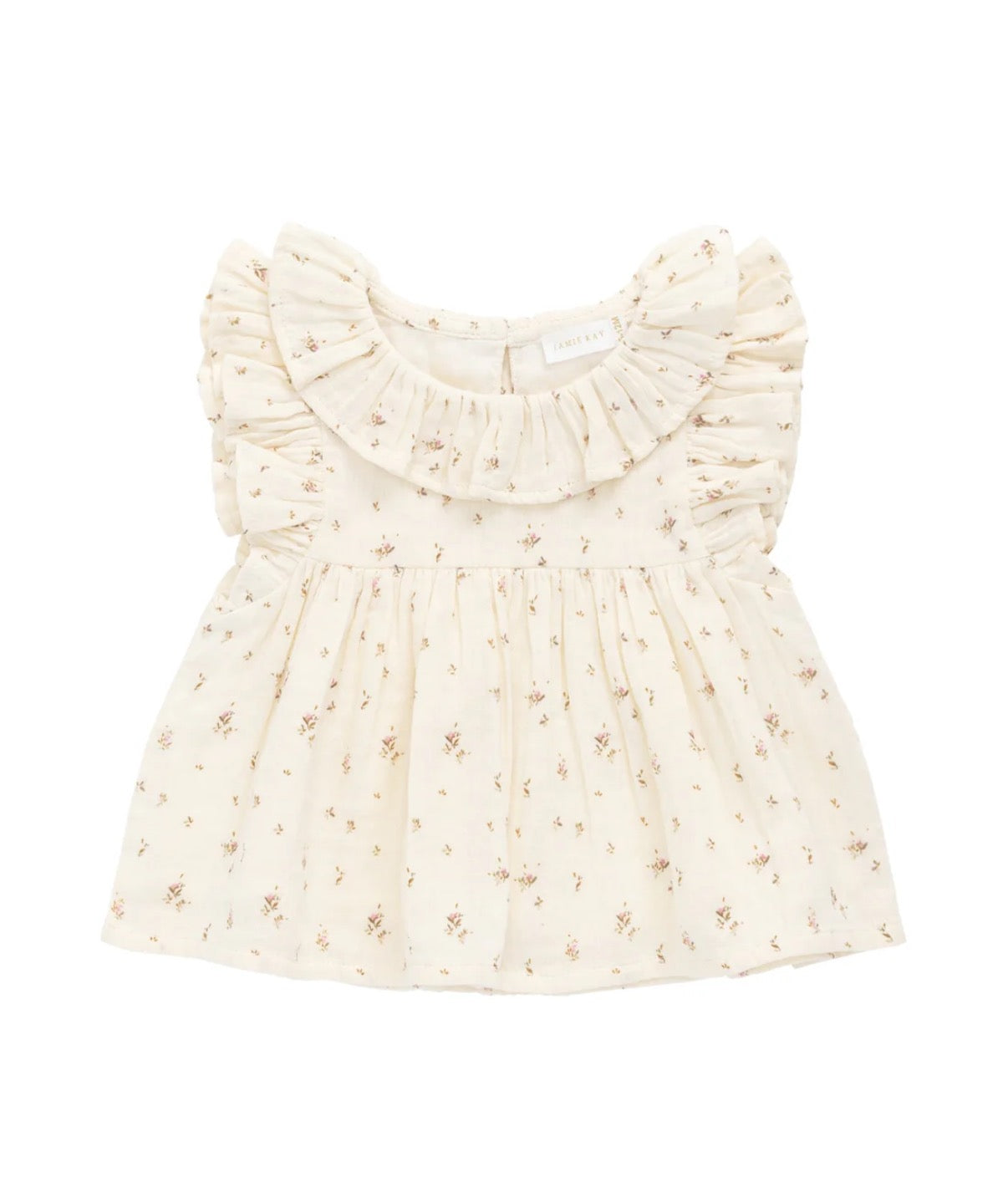 The Organic Cotton Muslin Banks Blouse – Dina Antique is a beautifully dainty piece, perfect for layering or wearing on its own. Featuring a soft antique hue with a scattered floral print, this sleeveless blouse includes a ruffled collar that gently cascades over the shoulders, adding a touch of vintage charm. The gathered waistline creates a subtle flare, making it both comfortable and elegant.