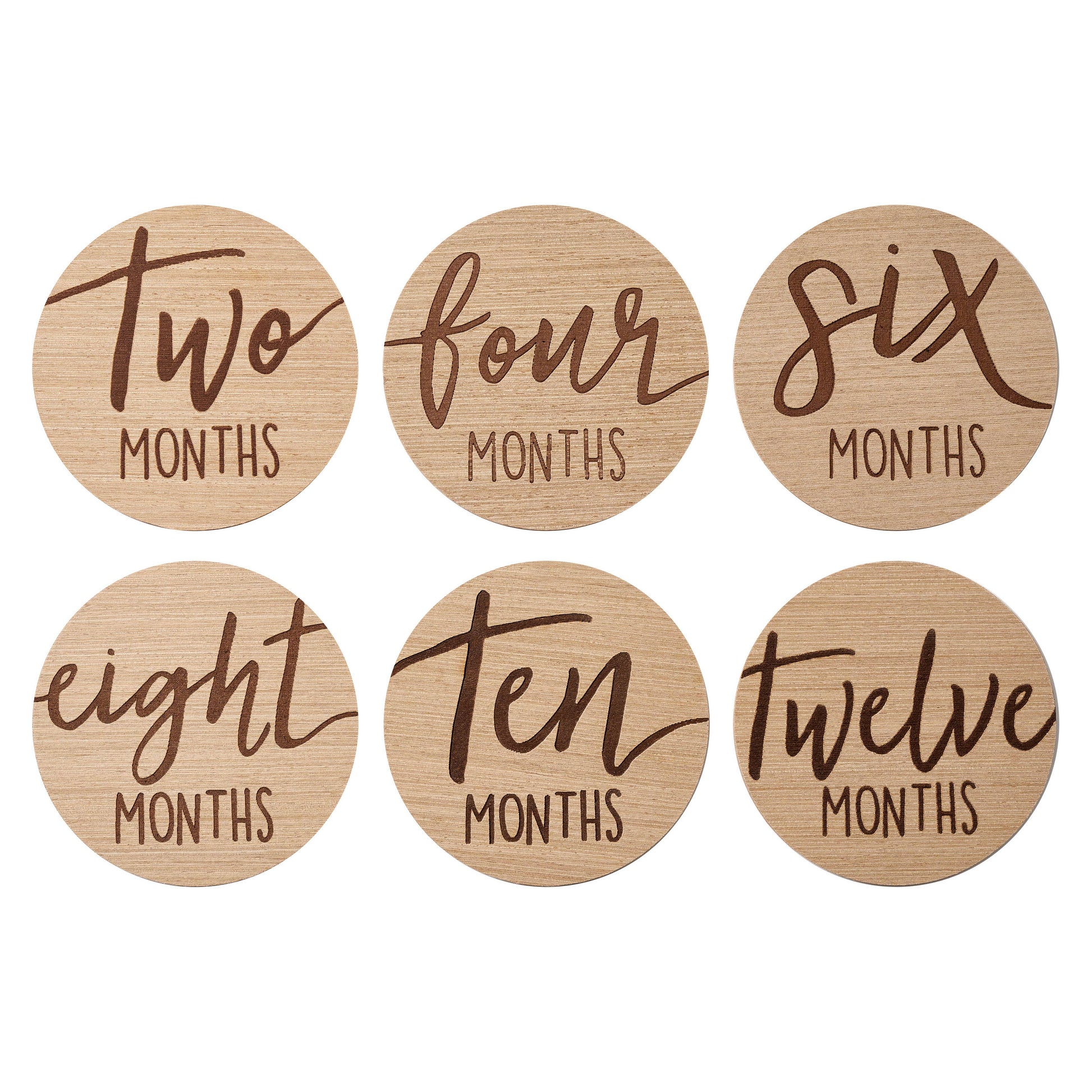 · Includes six double-sided circular wooden photo props for capturing baby’s first year and monthly milestone