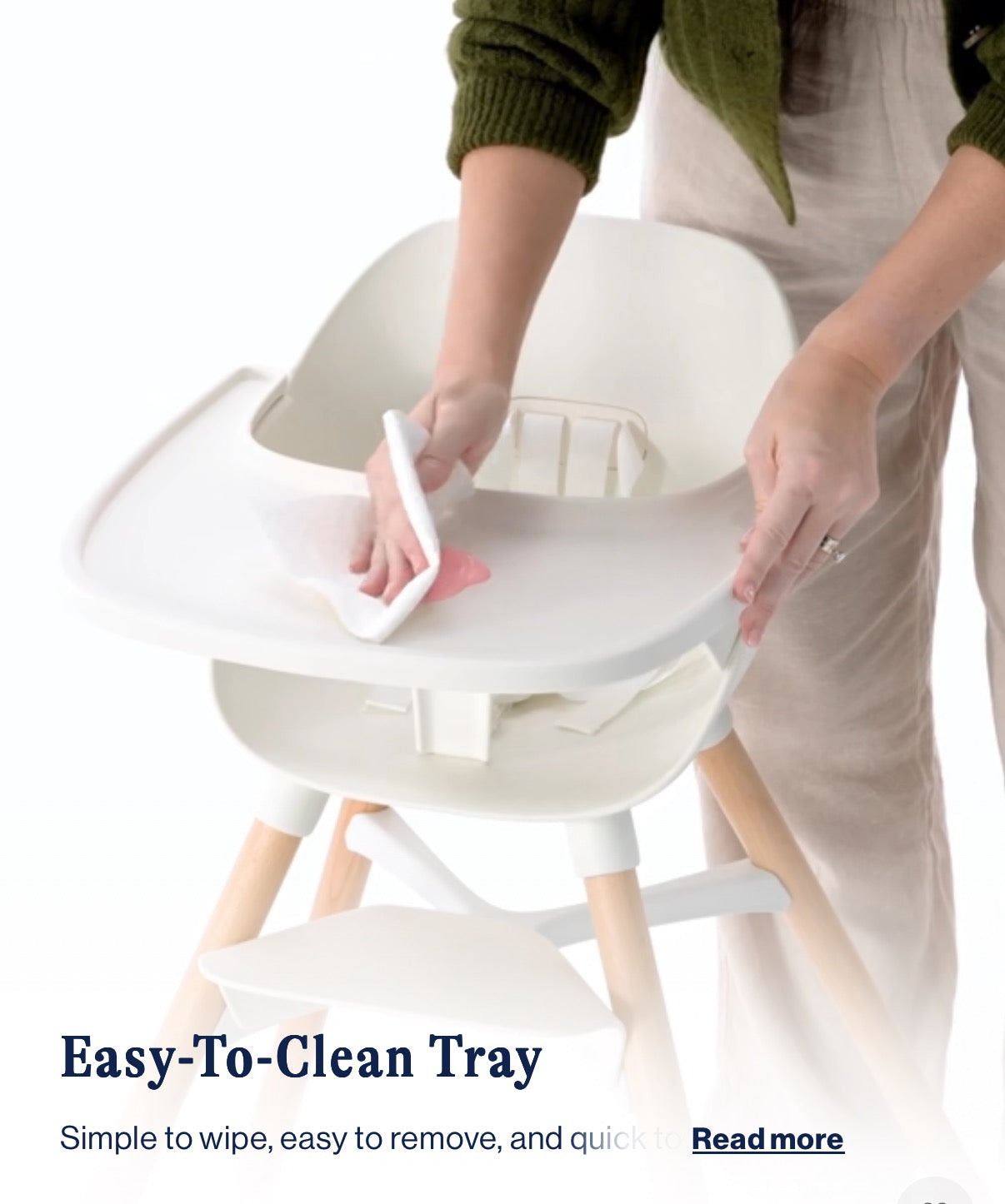 Seat + tray: Use a wet sponge and mild dish soap to wipe the surfaces of the seat and tray down.