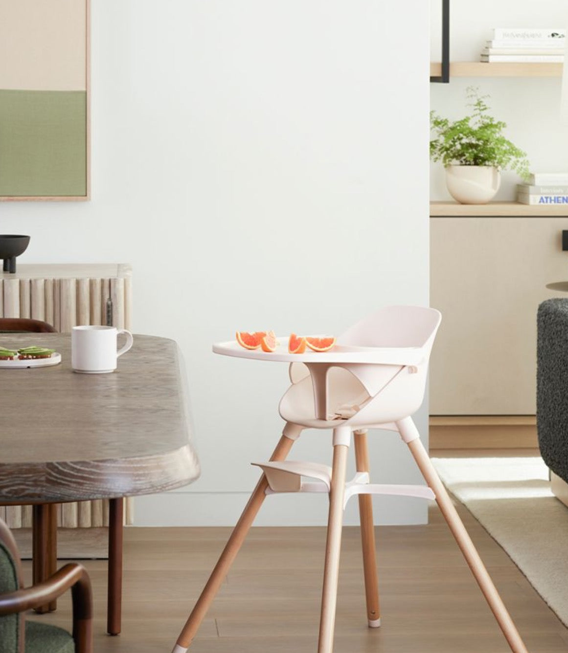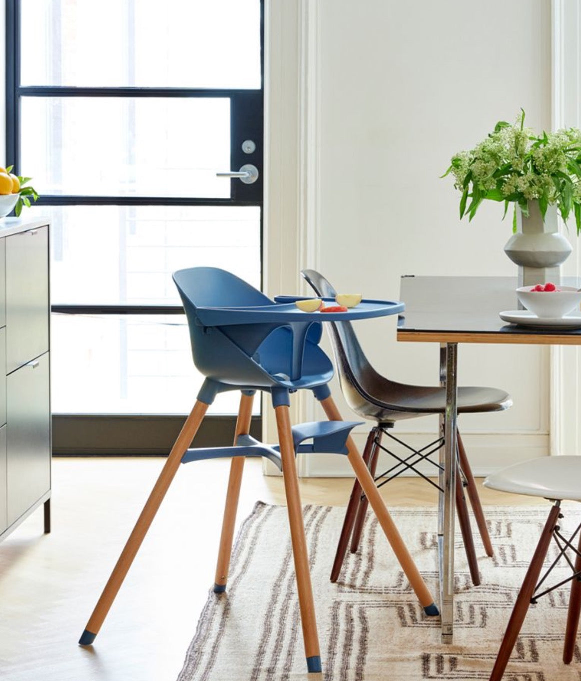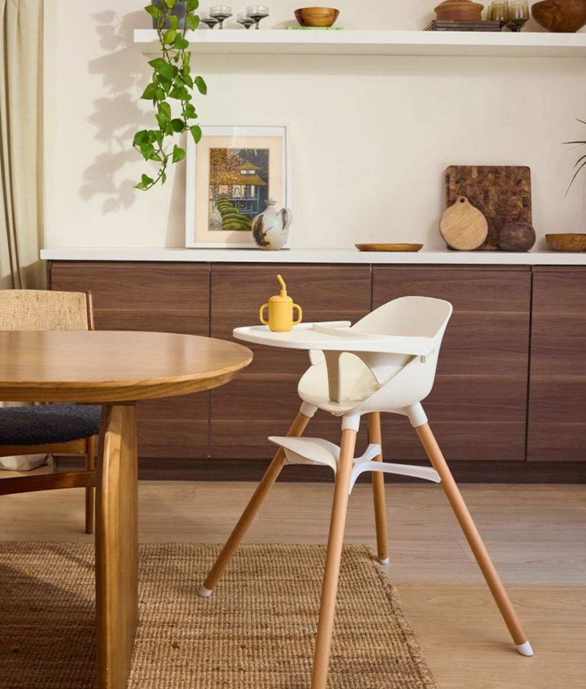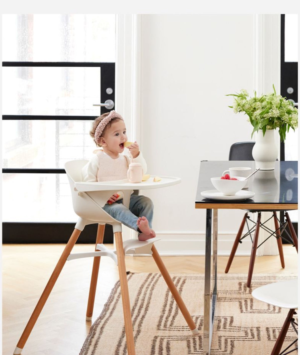 Materials: Legs: Sustainably sourced FSC Certified beech wood; Seat, Tray, Belly Bar, Foot Rest: Non-toxic plastic; Cross Bar: Aluminum; Straps: Nylon; Monochrome Legs: FSC certified beech wood with non-toxic finish.