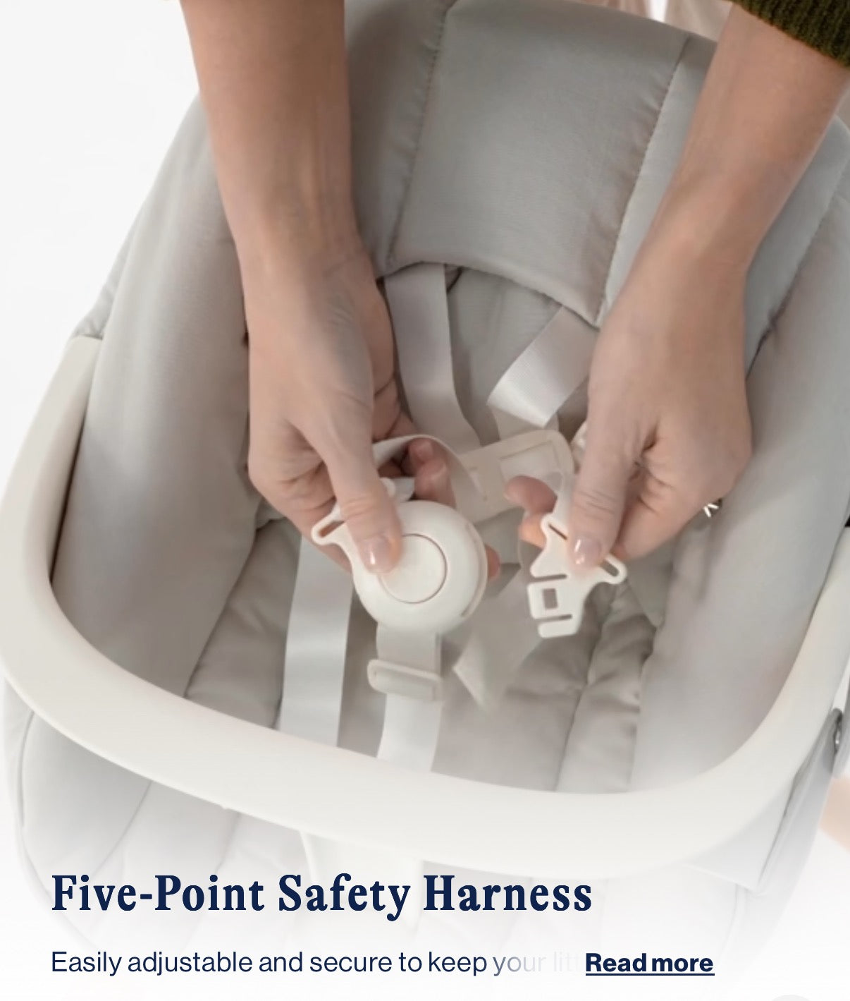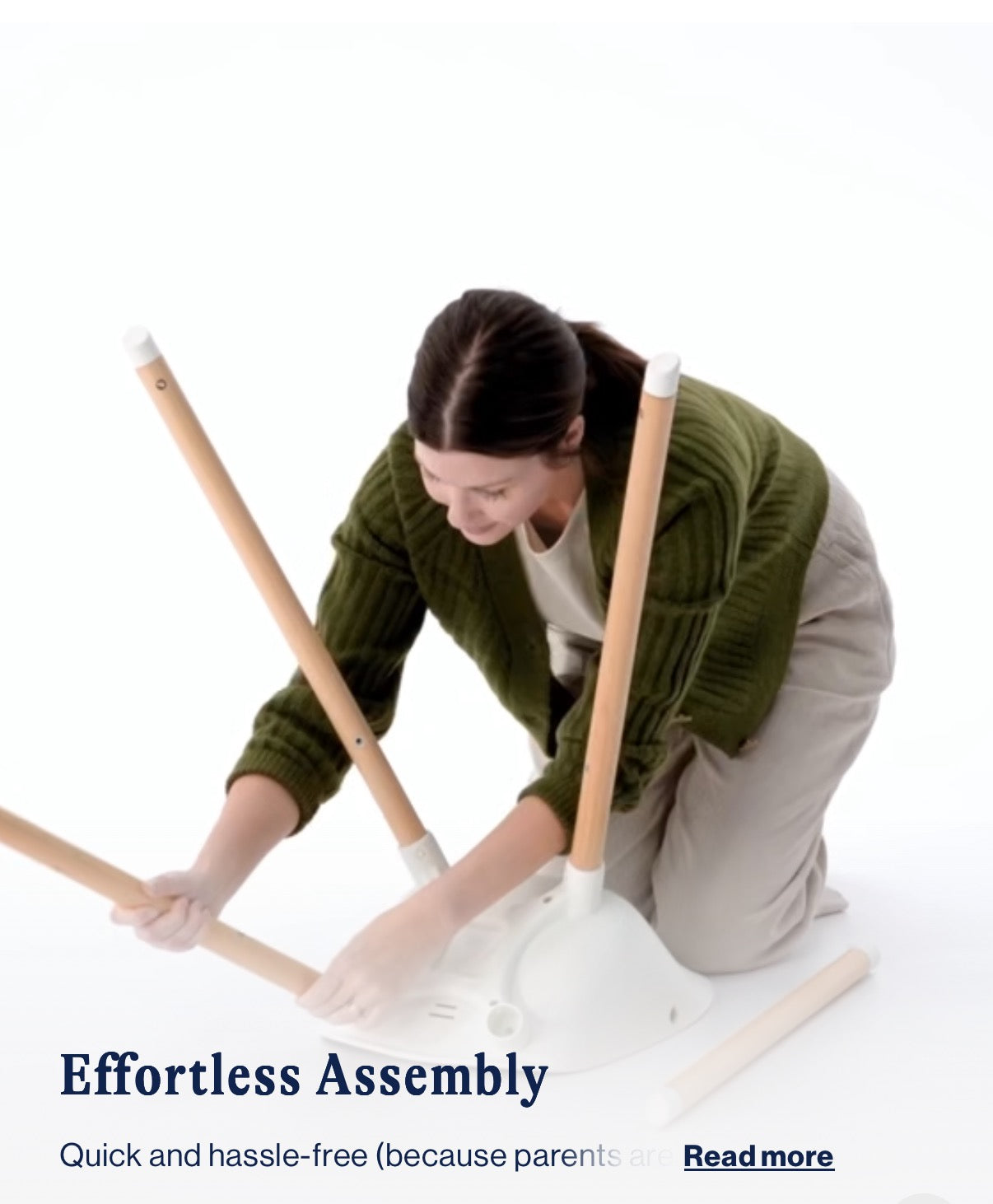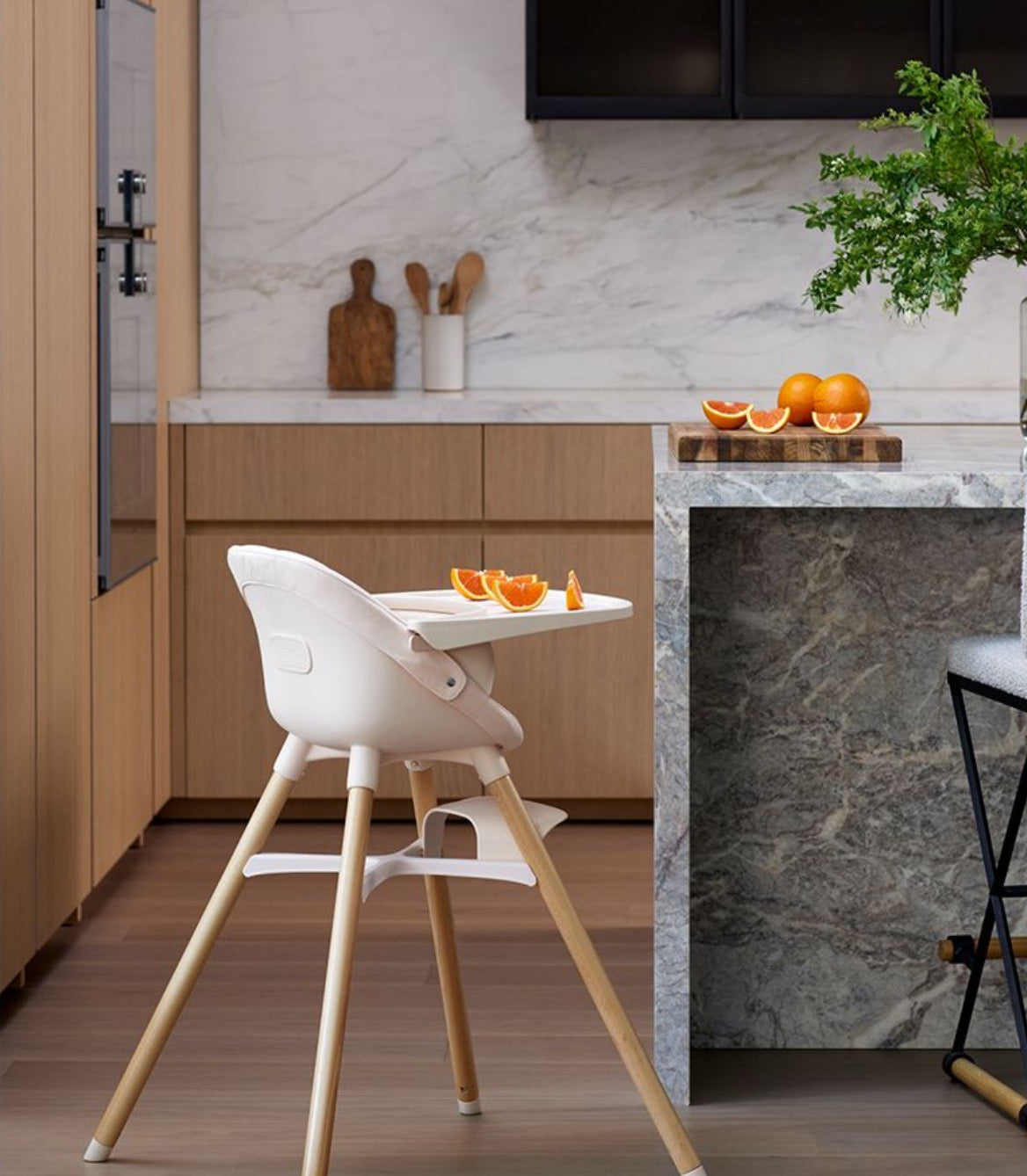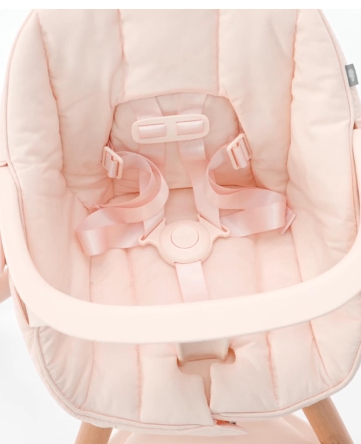 Materials: Legs: Sustainably sourced FSC Certified beech wood; Seat, Tray, Belly Bar, Foot Rest: Non-toxic plastic; Cross Bar: Aluminum; Straps: Nylon; Monochrome Legs: FSC certified beech wood with non-toxic finish.