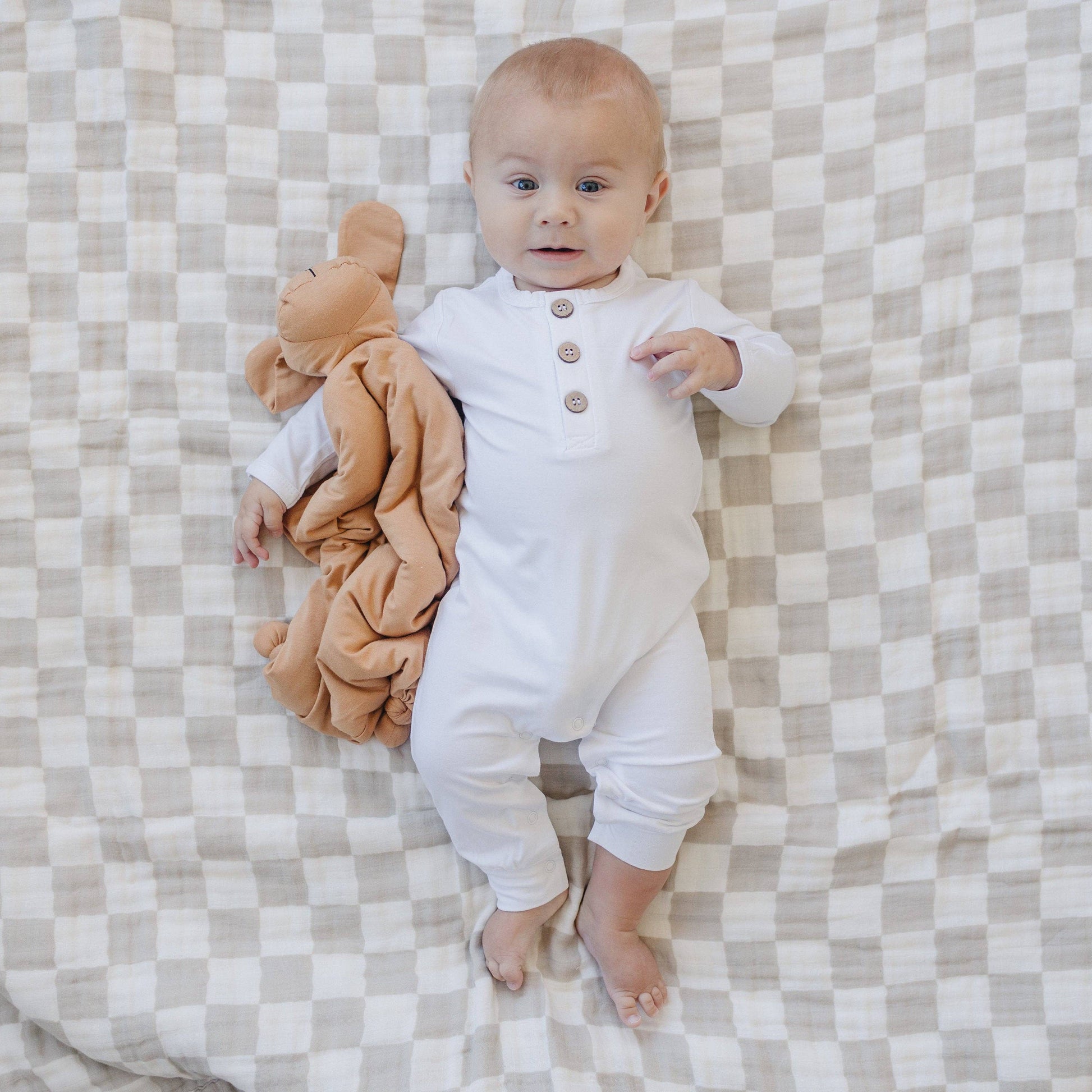 Measuring at 14.5x14.5" (excluding the animal head), our lovey is the perfect size for tiny hands to grasp and snuggle. Whether it's cuddle time, playtime, or on-the-go, this lovey