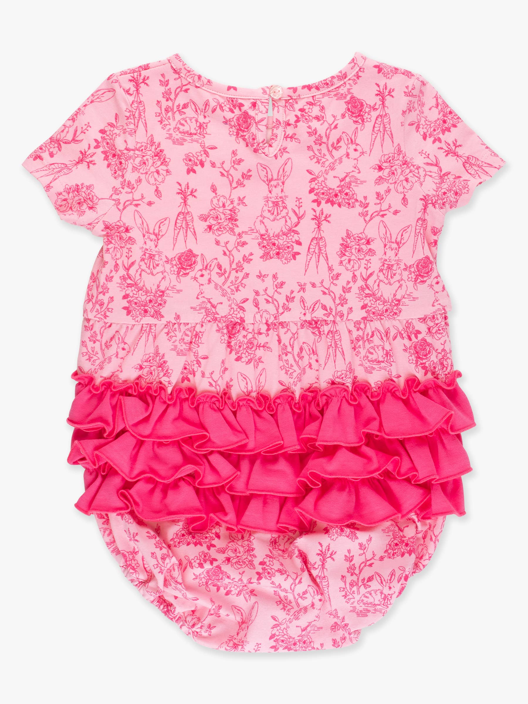 RuffleButts + RuggedButts - Baby Girls Pink Cottontail Toile Knit Short Sleeve Bow Bubble Romper