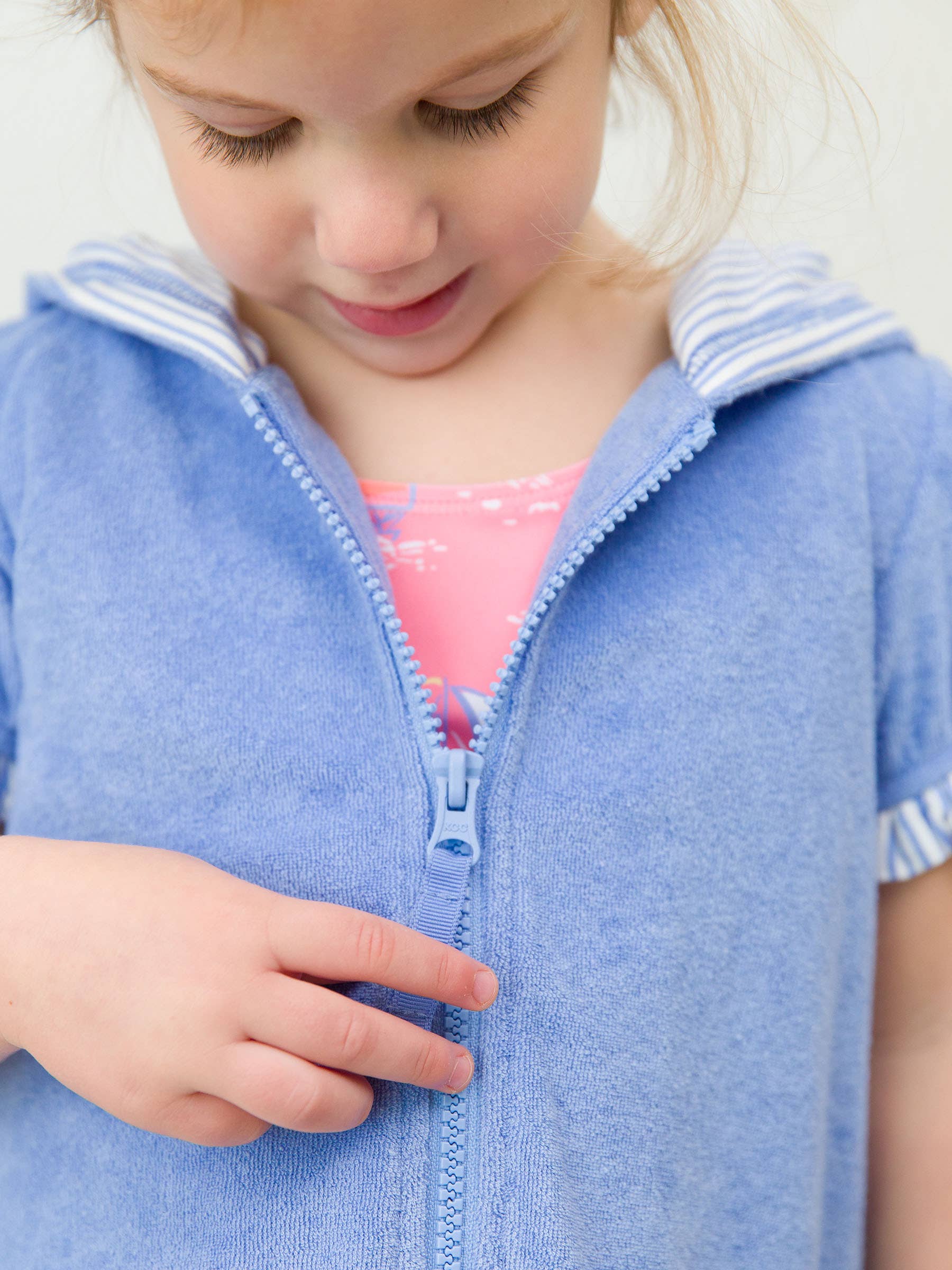 She'll be ready for all-day play in this adorable swimsuit cover-up. The full zip terry style is comfortable and flowy for your little one to throw on between swims. a functional hood keeps her cozy, and ruffle details add a girly touch. The beautiful, classic blue shade never goes out of style! Care Instructions: Machine wash cold; only non-chlorine bleach when needed; tumble dry low Fabric Content: 72% Polyester, 28% Cotton